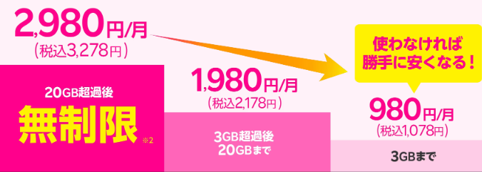 月額料金についても、3ギガまでなら1,078円、20ギガまでなら2,178円、それ以降はどれだけギガを使っても3,278円と利用データ量に合わせて料金が自動で変わるため、お得に使えます。