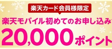 楽天カード会員の方が、2024年4月15日10:00までに楽天モバイルを新規で申し込むことで、20,000ポイントの楽天ポイントが貰えるというキャンペーンです。