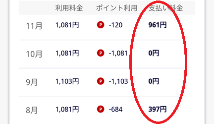 なので、スマホ料金が0円の月や397円の月があったりします。